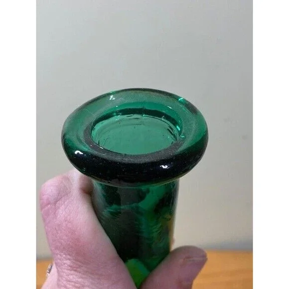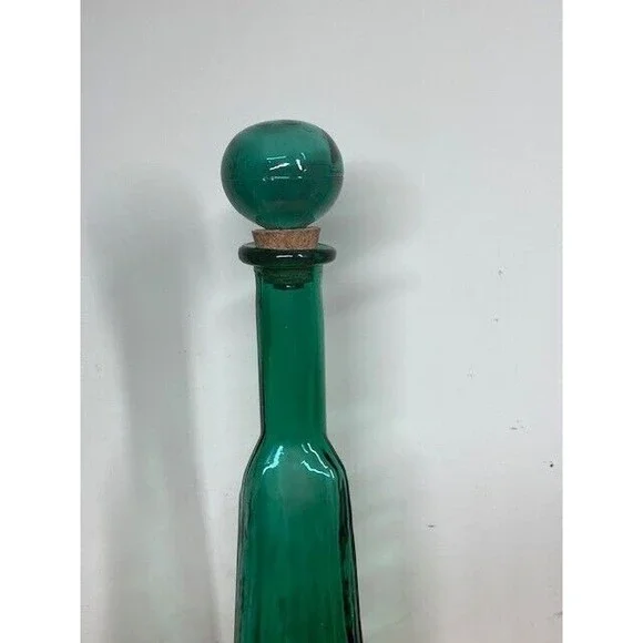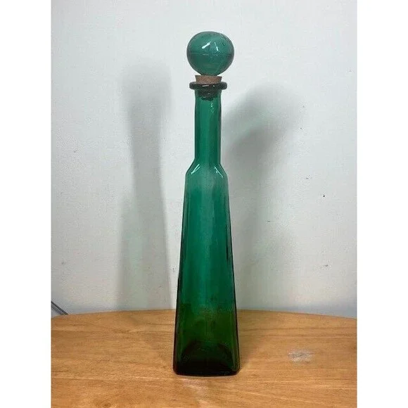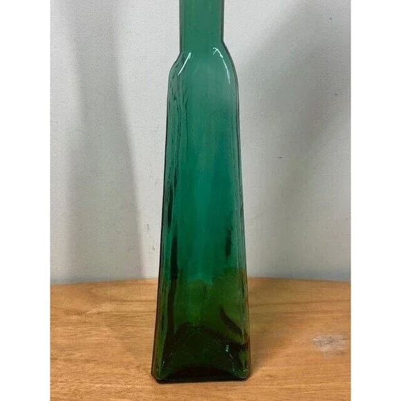 Vtg 90s Hinmark Enterprises 17" Green Glass Genie Decanter Bottle Cork StopperElevate your barware collection with the Vtg 90s Hinmark Enterprises 17" Green Glass Genie Decanter Bottle. The solid green color and unique triangular shape make it a standout piece, perfect for any occasion. Crafted from high-quality glass in Spain, this decanter is a testament to the stylish designs of the 90s. The decanter is adorned with a classic cork stopper, sealing in the vintage charm of the bottle. Whether it's used to serve drinks or simply displayed as a decorative item, this piece will add a touch of retro flair to your home. Hand wash only to maintain its beautiful appearance.Nice used condition. Was gift this back in 1996 and need to downsize. Not seeing any chips, cracks or repairs.Office - Curio Cabinet