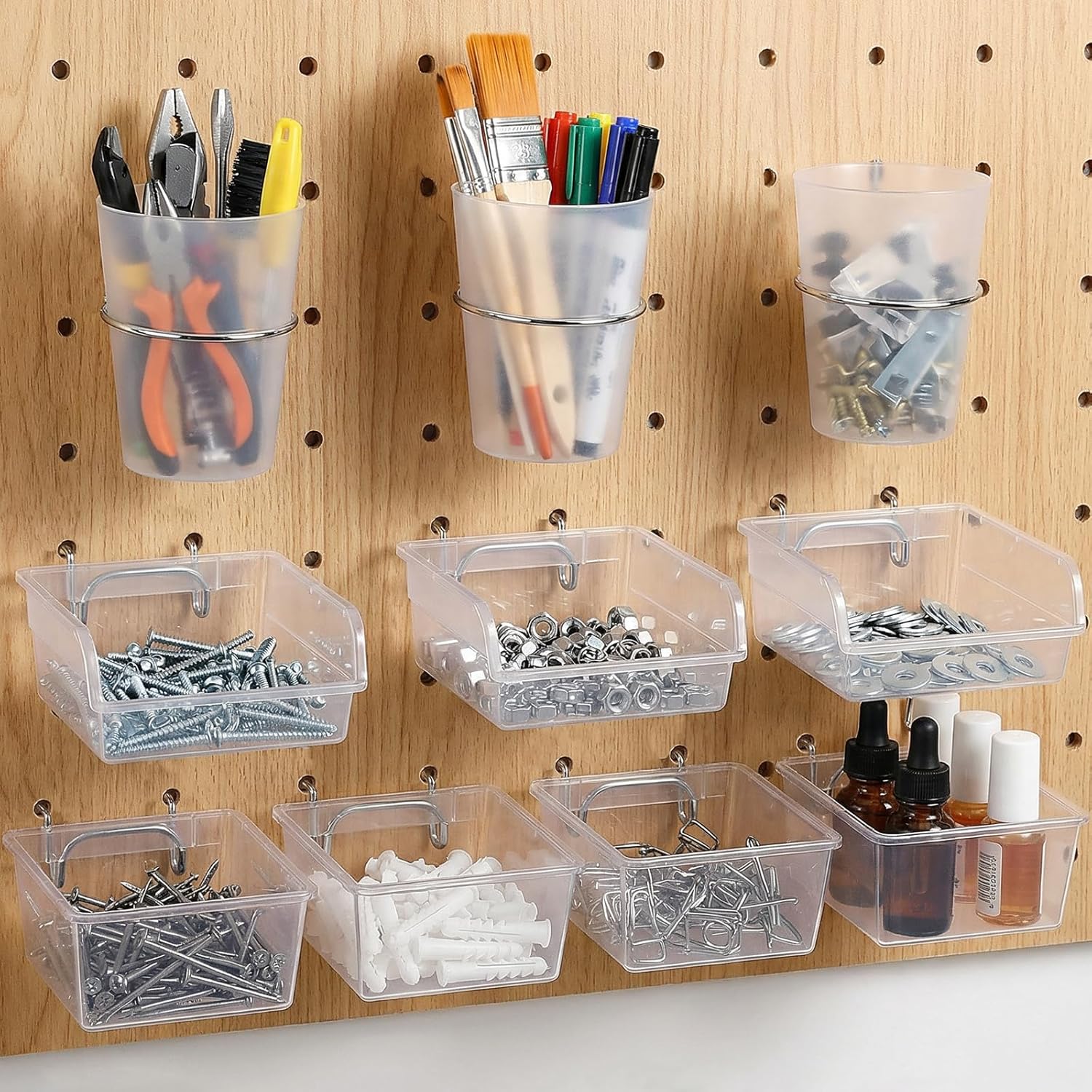 Dear customer, welcome to our store and thank you for choosing us. If you are dissatisfied with anything during the shopping process, please let me know, and we will correct it promptly and do our best to provide you with a pleasant shopping experience.Specification:Product Name: 20 Pcs Pegboard Bins and Cups with Hooks and Loops, Transparent Plastic Pegboard Storage Baskets Multipurpose Peg Board Organizer AccessoriesMaterial: PP + IronColor: TransparentProduct Dimensions:Small Pegboard Bins: 3.6×3.1×1.9 in / 9.2×8×4.7 cm (Top LxWxH)Large Pegboard Bins: 3.9×3.9×1.9 in / 10×10×4.7 cm (Top LxWxH)Metal Hooks: 2.0 in / 5 cmPegboard Cups: Top Diameter 2.8 in / 7 cm, Bottom Diameter 1.9 in / 4.7 cm, Height 3.9 in / 10 cmSmall Cup Holder Inner Diameter: 2.5 in / 6.3 cmPackaging: BoxedPackaging Dimensions: 20*20*11 (cm)Packaging Weight: 975 (g)Package List:10 x Small Pegboard Bins5 x Large Pegboard Bins15 x Metal Hooks5 x Pegboard Cups5 x Small Cup Holders
