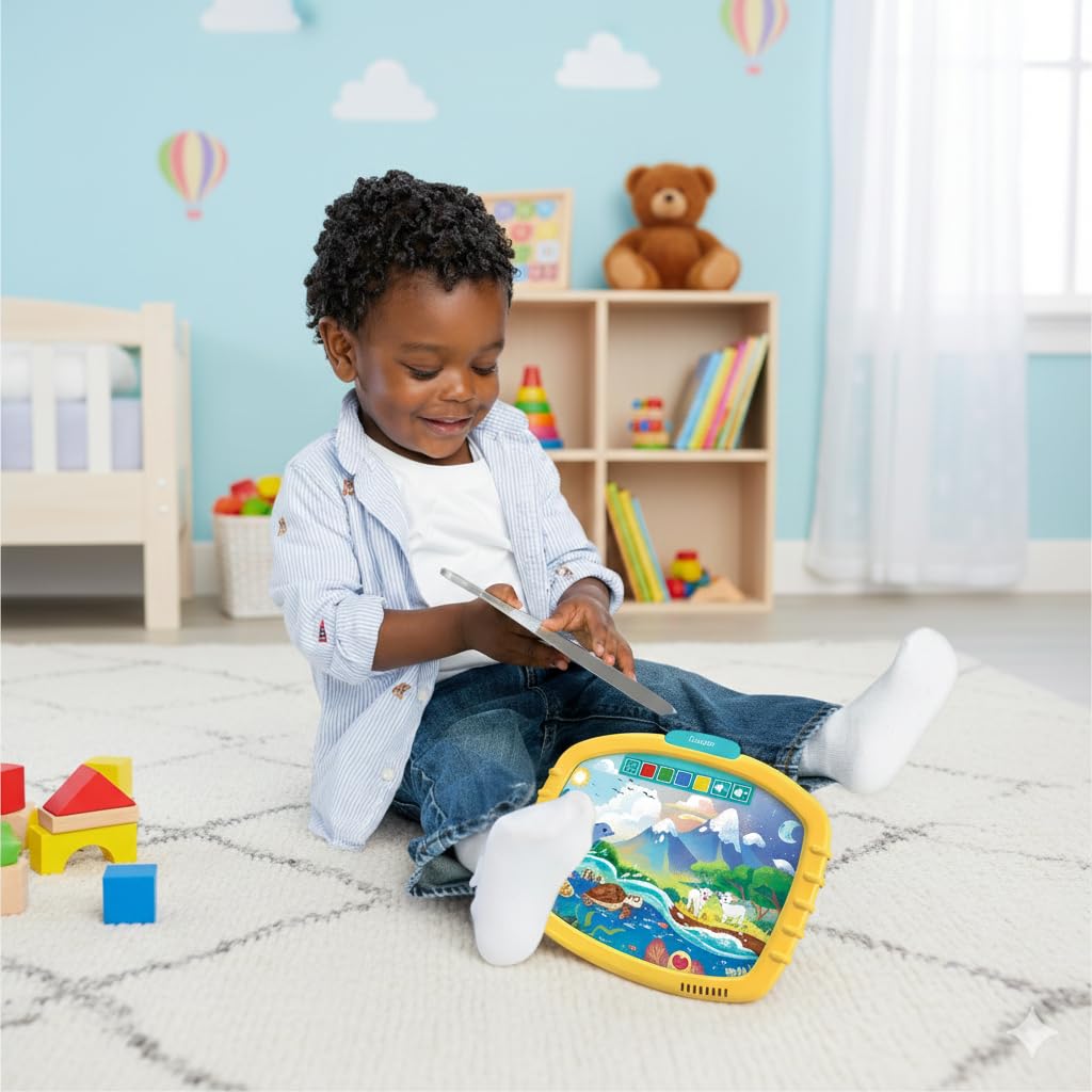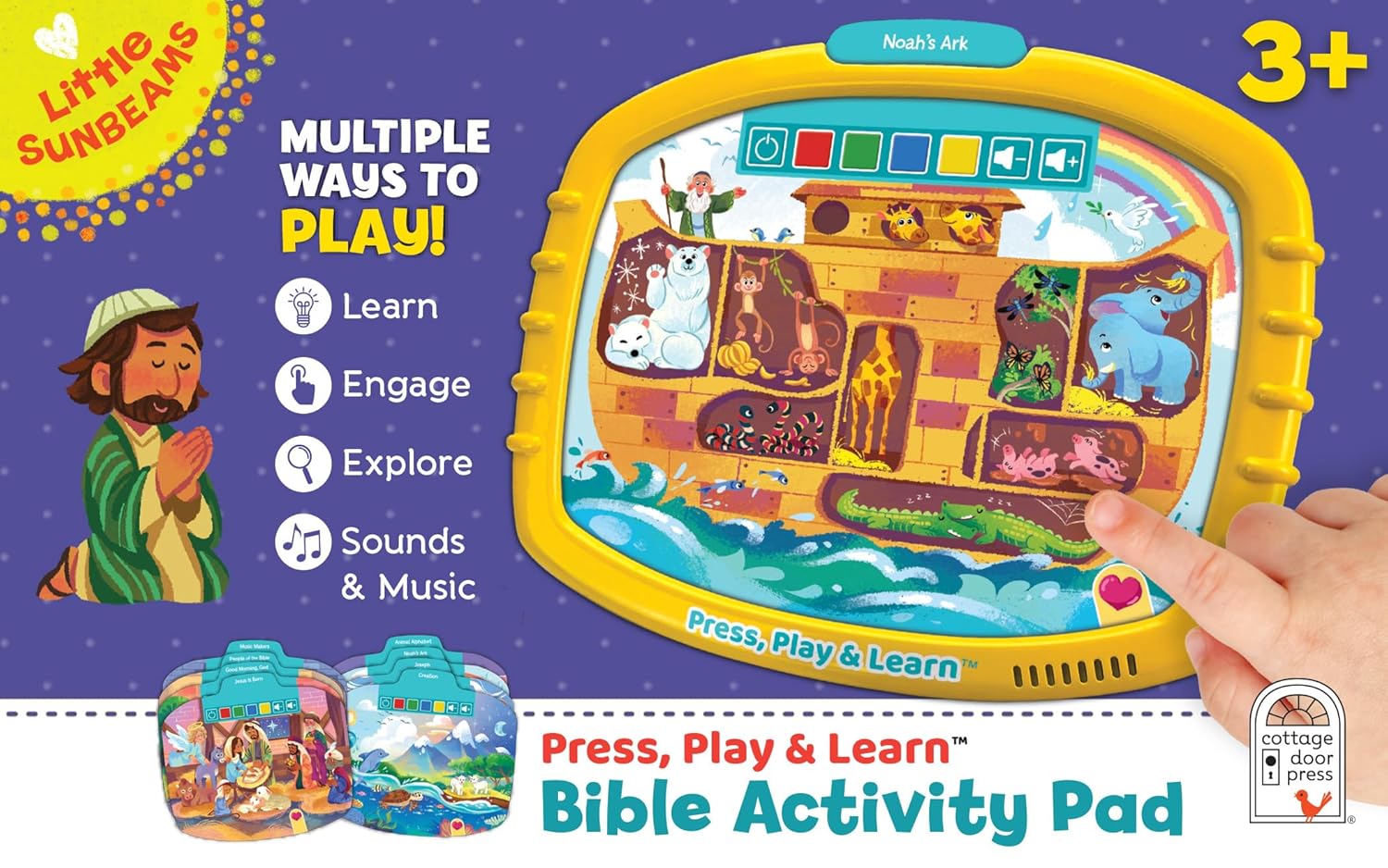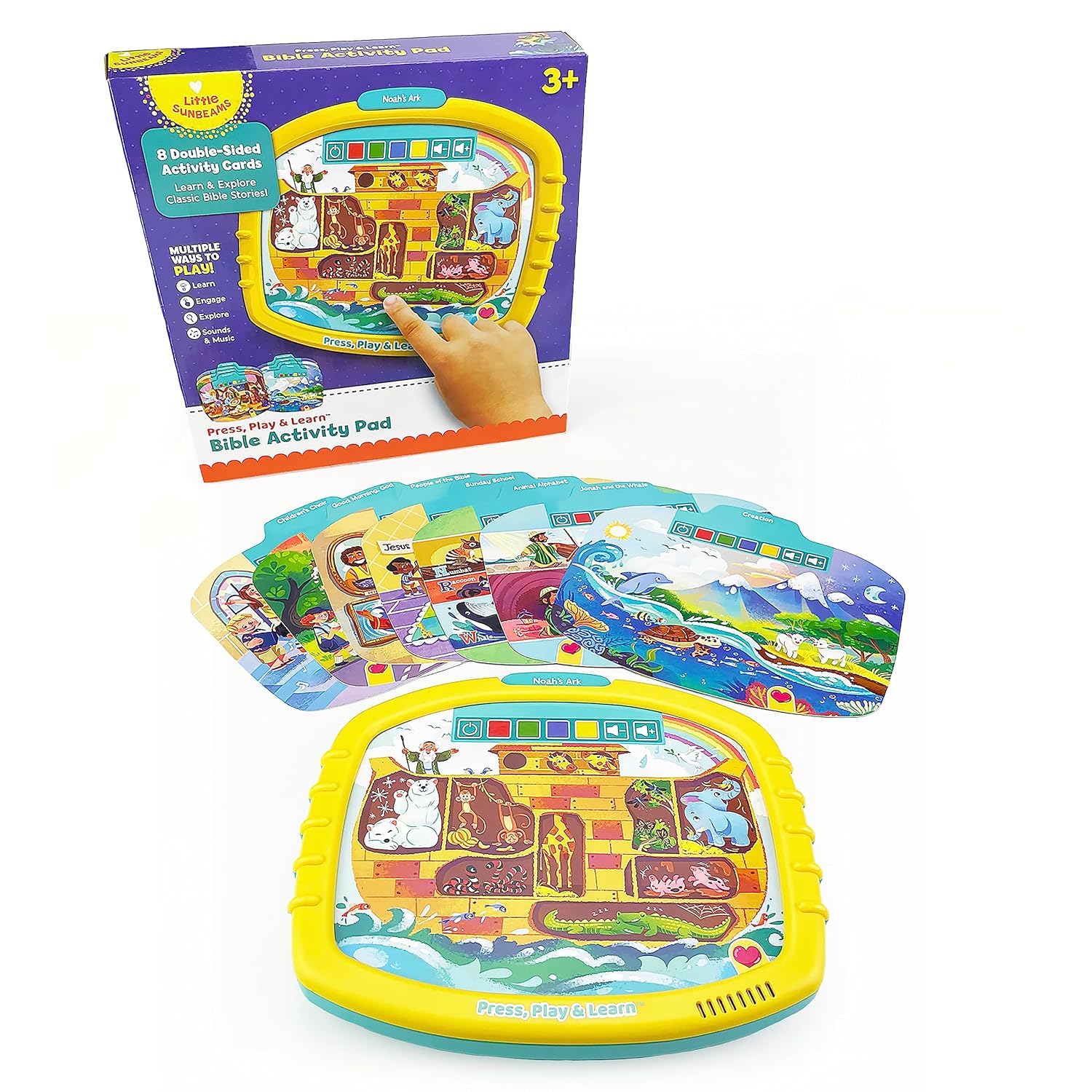 Interactive Bible activity pad reads, sings, and asks questions! 16 busy scenes feature modes for matching, looking and finding, thinking, and guessing. Also hear favorite Bible story moments and sing along with best-loved Bible songs. Card themes are God Made the World, Garden of Eden, Noah's Ark, Daniel in the Lion's Den, Jonah, First Christmas, Sunday School, Children's Choir, and others. More than 200 activities for hours of learning fun for boys and girls! The card reader reinforces early learning essentials in a fun and interactive way to engage and motivate young learners. Cards store in the back of the tablet making them easy to track and to take on-the-go. No computer or internet hook-up is necessary! A great introduction to early learning tablets! Perfect Easter gift, great for Christian family time all year long!PRESS, PLAY, AND LEARN! Choose and insert a card, then press the card selector "wheel icon" to begin! Listen to the prompts and follow along to explore the farm. Activity tablet defaults to LEARN mode. Don't forget to touch objects more than once for double surprises! Press around the page to explore hidden bonus sounds!4 MODES OF PLAY: LEARN, ENGAGE, EXPLORE, AND SOUNDS & MUSIC. LEARN & ENGAGE modes teach fun facts, rhyming patterns, following directions, experimentation, and more. EXPLORE mode activates games for memory & recall and questions & answers. SOUNDS & MUSIC modes explore fun sound and music activities for added play patterns.EASY TO TOUCH: Buttons are easy to use for preschool age and up. Press characters and objects in the picture to hear sounds, songs, and respond to prompts. The electronic early learning activity pad teaches early learning concepts including ABCs, counting, colors, shapes, sounds, and more! A first computer-like learning pad stimulates young minds with easy-to-follow activity cards.FUN-FILLED ACTIVITIES: 16 activity-filled scenes to hunt through. Activity topics range from hunt & find, piano & music, matching, animal sounds & facts, and more. The Little Sunbeams Bible Card Reader touches on a variety of concepts designed to entice young minds' interest in animals, nature, kindness, caring, people, places, and more, all in a Christian light.AUTOMATIC TURN-OFF: The activity card reader times out after 30 seconds of inactivity to save battery life. To begin again, press the power button back on. Includes volume control buttons, making it easy for kids to increase or decrease sound levels. Easy storage keeps the cards and tablet together for on-the-go fun. Takes 3 AAA batteries, not included. Read more