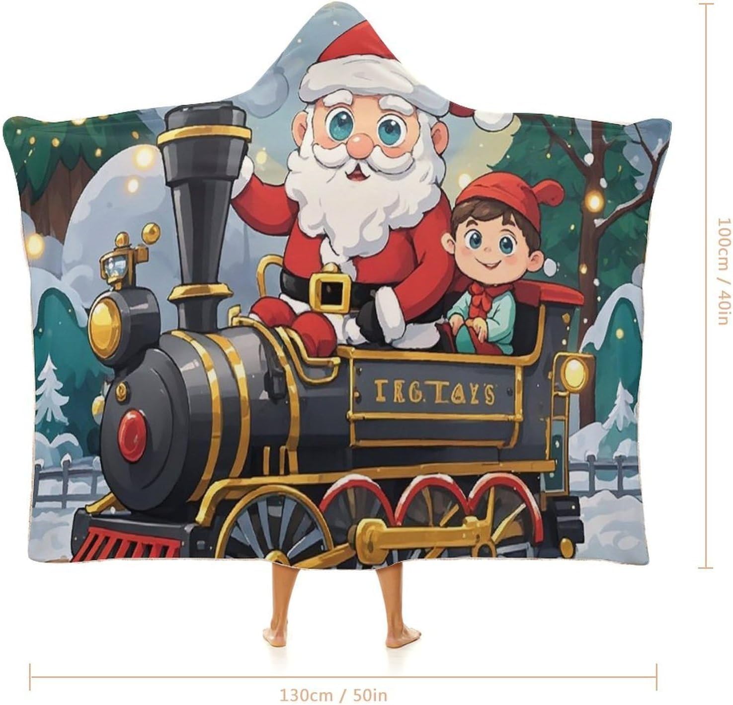 Wrap yourself in luxury with our Wearable Hooded Blanket!PREMIUM MATERIAL:Crafted from premium arctic velvet, this reversible blanket combines ultra-softness with durability. The smooth, non-shedding surface and flesh-pink interior feel gentle against your skin, while the breathable fabric ensures comfort without overheating.PRACTICAL BLANKET:Designed for convenience, the attached hood stays secure without dragging, making it easy to move around while staying cozy. Whether you're reading on the sofa, camping outdoors, gaming with friends, or napping, this wearable cloak blankets you in warmth wherever you go.DURABLE & SKIN-FRIENDLY:Meticulously stitched with vibrant colors, this Christmas Train blanket retains softness and shape after washing. No bleach required. Designed for everyday use.EXQUISITE WORKMANSHIP:Delicate stitching, high-definition printing and dyeing, clear patterns, bright colors, no fading, many choices, it is warm and beautiful when worn on the body.WARM GIFT:This super soft cloak blanket is specially designed for intimate love, loved ones, friends gift for Christmas Thanksgiving gifts, beautiful and soft blanket is to bring them warmth, joy and love feeling.EASY MAINTENANCE:Machine washable (cold water) for hassle-free cleaning, it retains its vibrant color and plush texture wash after wash. Embrace versatility and comfort.Size:40 inches x 50 inches / 100cm x 130cm50 inches x 60 inches / 130cm x 150cm60 inches x 80 inches / 150cm x 200cmI wish you a pleasant shopping experience!