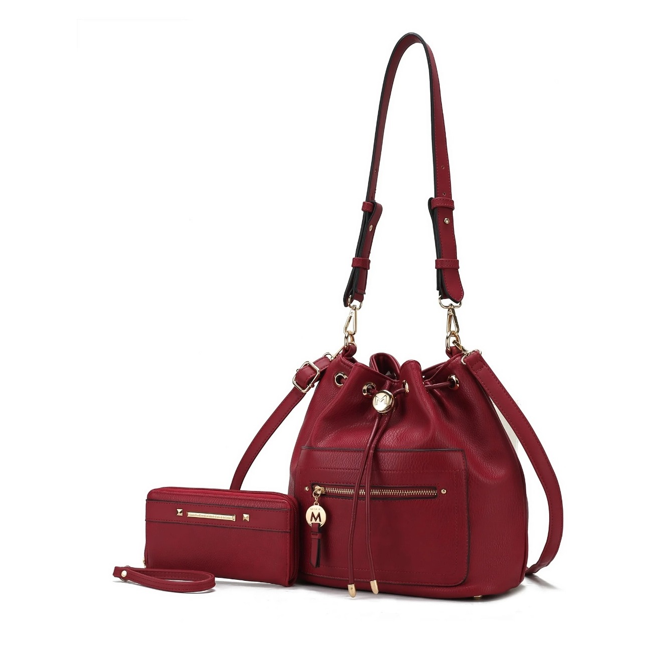 A chic red faux leather bucket bag and matching wallet set from MKF Collection by Mia K. This set features a textured finish, gold-tone hardware, and a convenient drawstring closure on the bag. The accompanying wallet is slim and stylish with studded accents and a signature gold-tone plate. Perfect for everyday use, a stylish brunch outfit, or a night out.