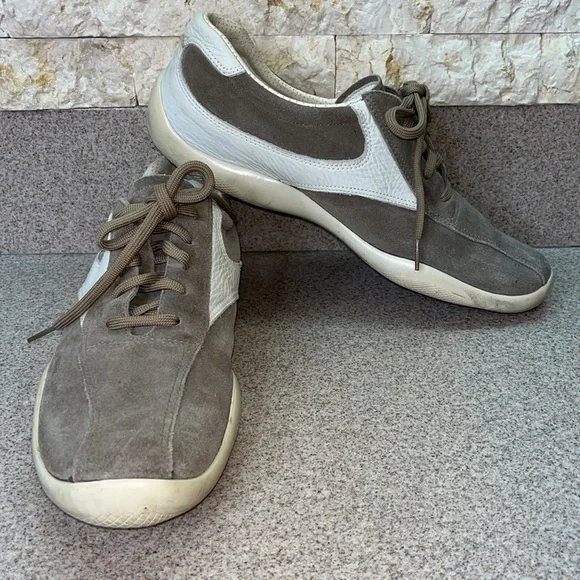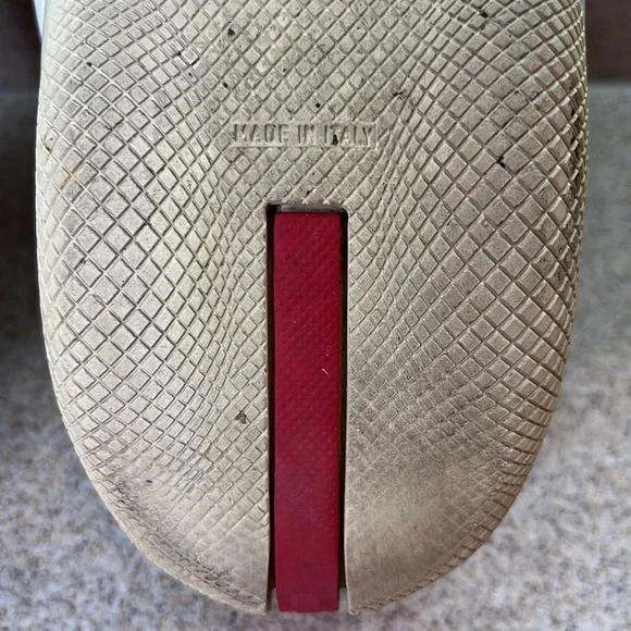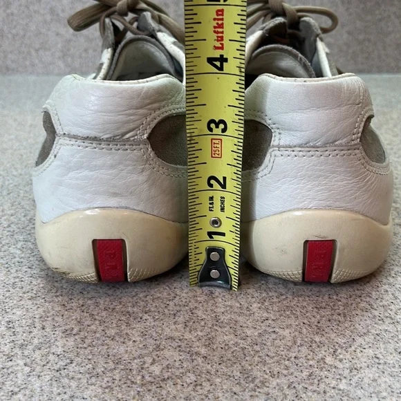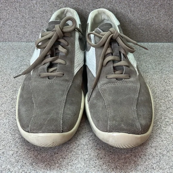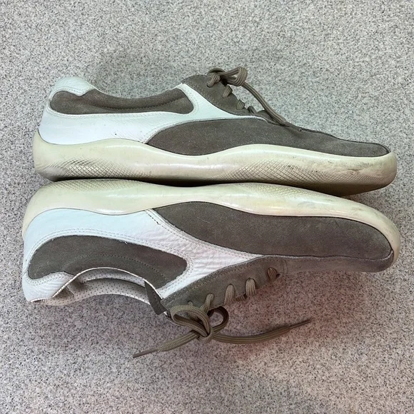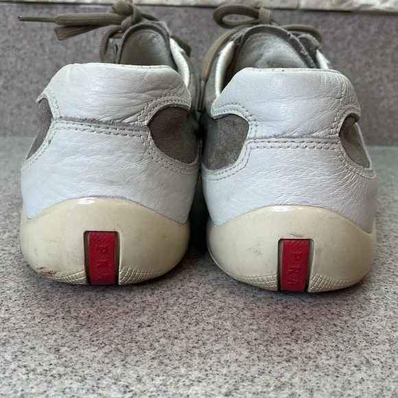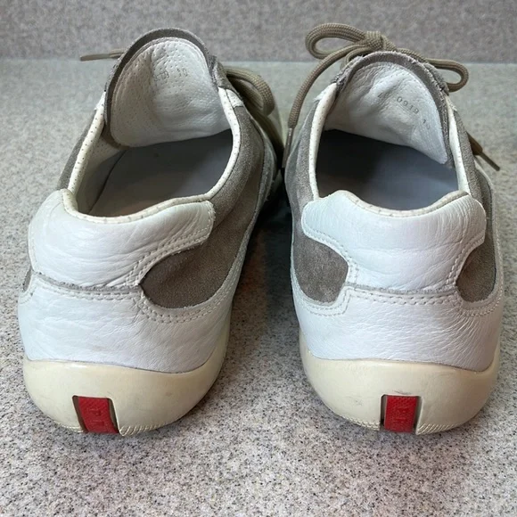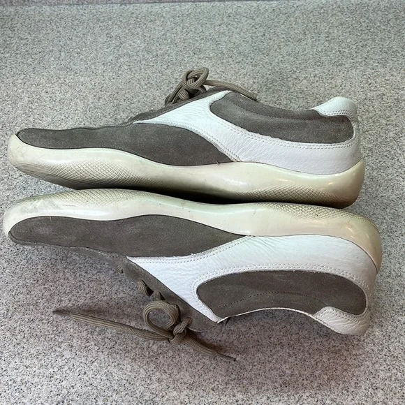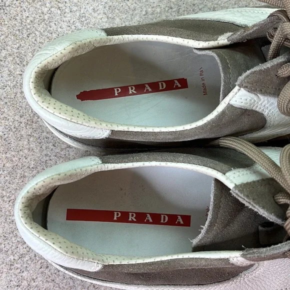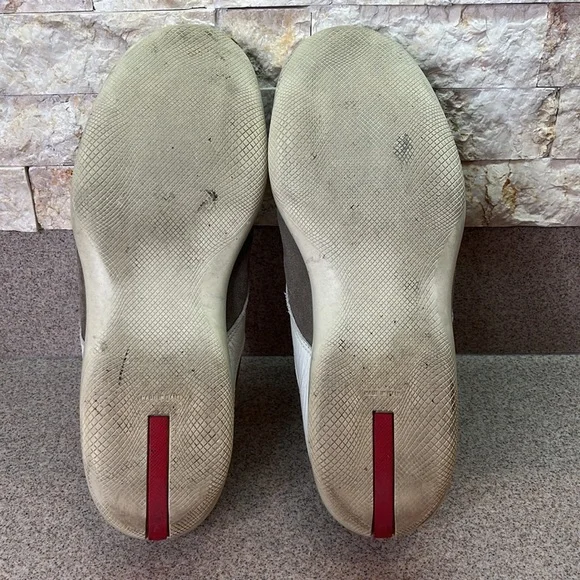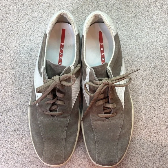 These are previously owned, and do show where. But overall the suede and material is in excellent condition. Made in Italy. Numbers stated on the tongue are shown in the photo. Prada sizes explained below! Comes from a smoke free home. Please ask any questions prior to buying.Elegant Prada low top sneakers, trainers, in beige suede and white leather.They feature:- suede leather uppers - leather lining- rubber soles- Size on tongue is stated 10 equal too 44.3 (EU) 10 (UK) 11 (US)