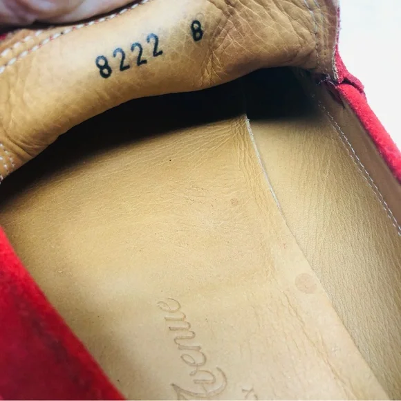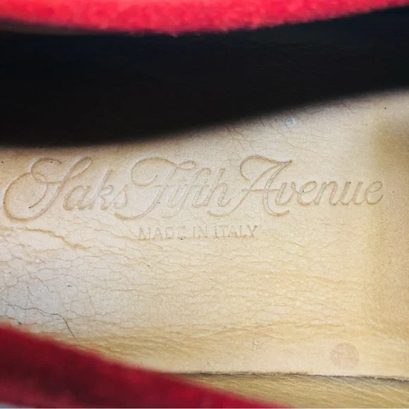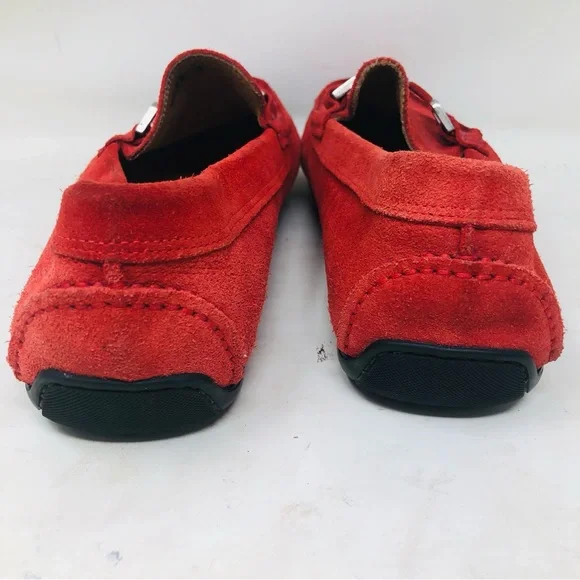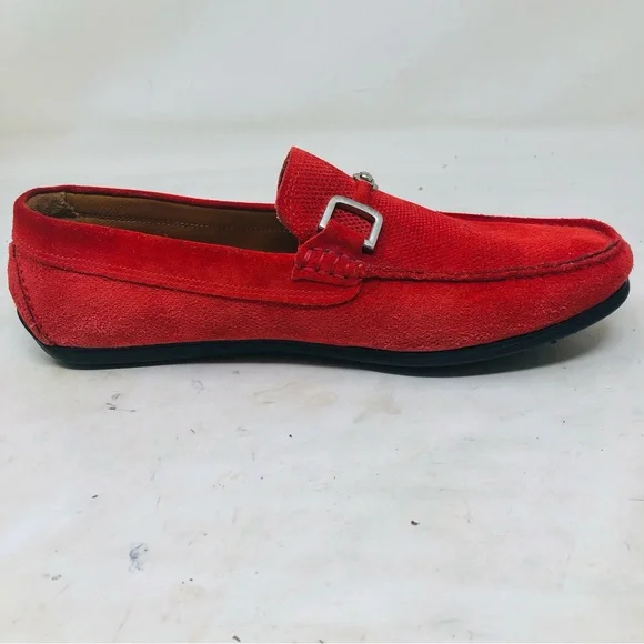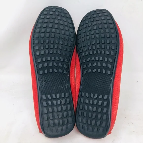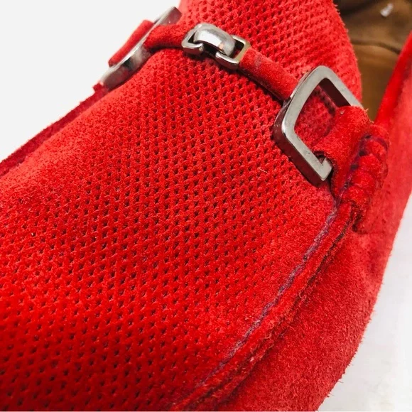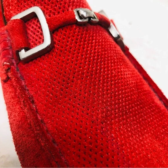 Bold and stylish red suede loafers from Saks, featuring a classic bit buckle detail for a sophisticated touch. These shoes combine luxury and comfort, perfect for adding a vibrant statement to both casual and formal outfits. Crafted with premium materials and excellent craftsmanship. Excellent pre-owned condition with minimal signs of wear.
