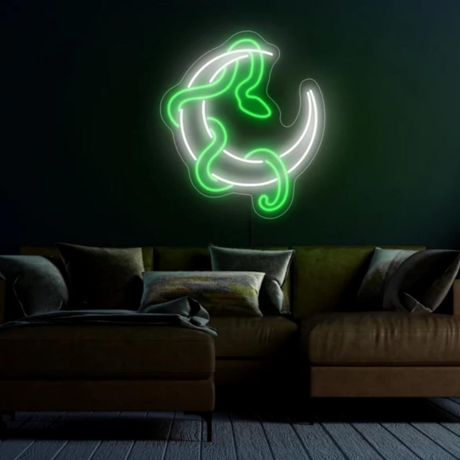 Illuminate your space with our mesmerizing Snake Around Moon Neon Light, featuring an enchanting celestial design where a sleek serpent gracefully coils around a glowing crescent moon. This captivating LED decor piece blends mystical symbolism with modern aesthetics, perfect for adding a touch of magic to bedrooms, meditation spaces, or bohemian-inspired interiors. Crafted from high-quality, flexible neon tubing, it offers a soft yet vibrant glow in customizable colors to match your ambiance. Energy-efficient and easy to install (USB-powered with included mounting kit), this unique light is ideal for moon phase lovers, spiritual decorators, or anyone drawn to celestial and serpent motifs. A striking statement piece or a thoughtful gift for those who adore witchy, astrology, or nature-themed decor.