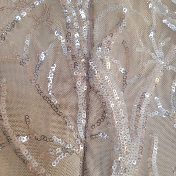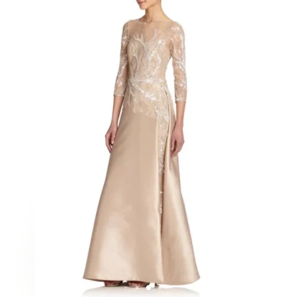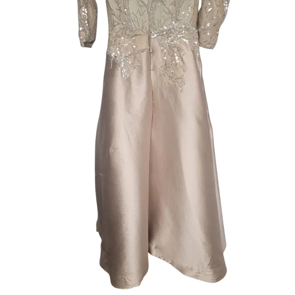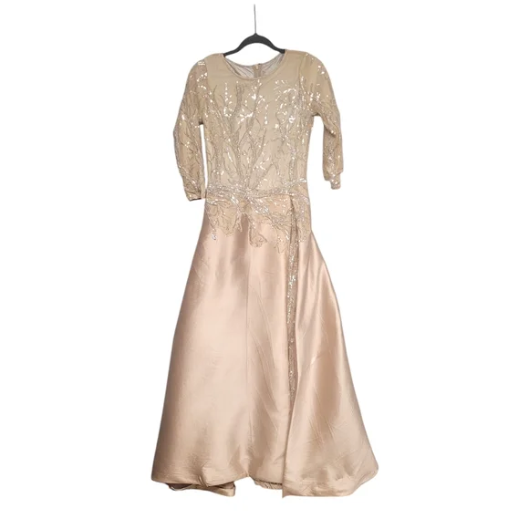 Teri Jon Champagne Beaded DressThe top of the dress has been altered a bit for a modest fashion boutique.The top has been lined up so it's not opaque. This gown is gently worn, in good condition. Please see photos for reference. Measurements straight across Shoulder to shoulder: 13"Pit to pit: 15"Waist: 13.5"Length: 56"Dress description Beaded embellishment at bodice, sheer yoke and three-quarter sleevesBoatneck with satin banded trimFlared skirtConcealed back zipper with button closureLinedPolyester/silk Sequined branches encircle the bodice of this elegant satin gown, adding a magical element. Beaded embellishment at bodice, sheer yoke and three-quarter sleevesBoatneck with satin banded trimFlared skirtConcealed back zipper with button closureLinedPolyester/silkContrast: Polyester